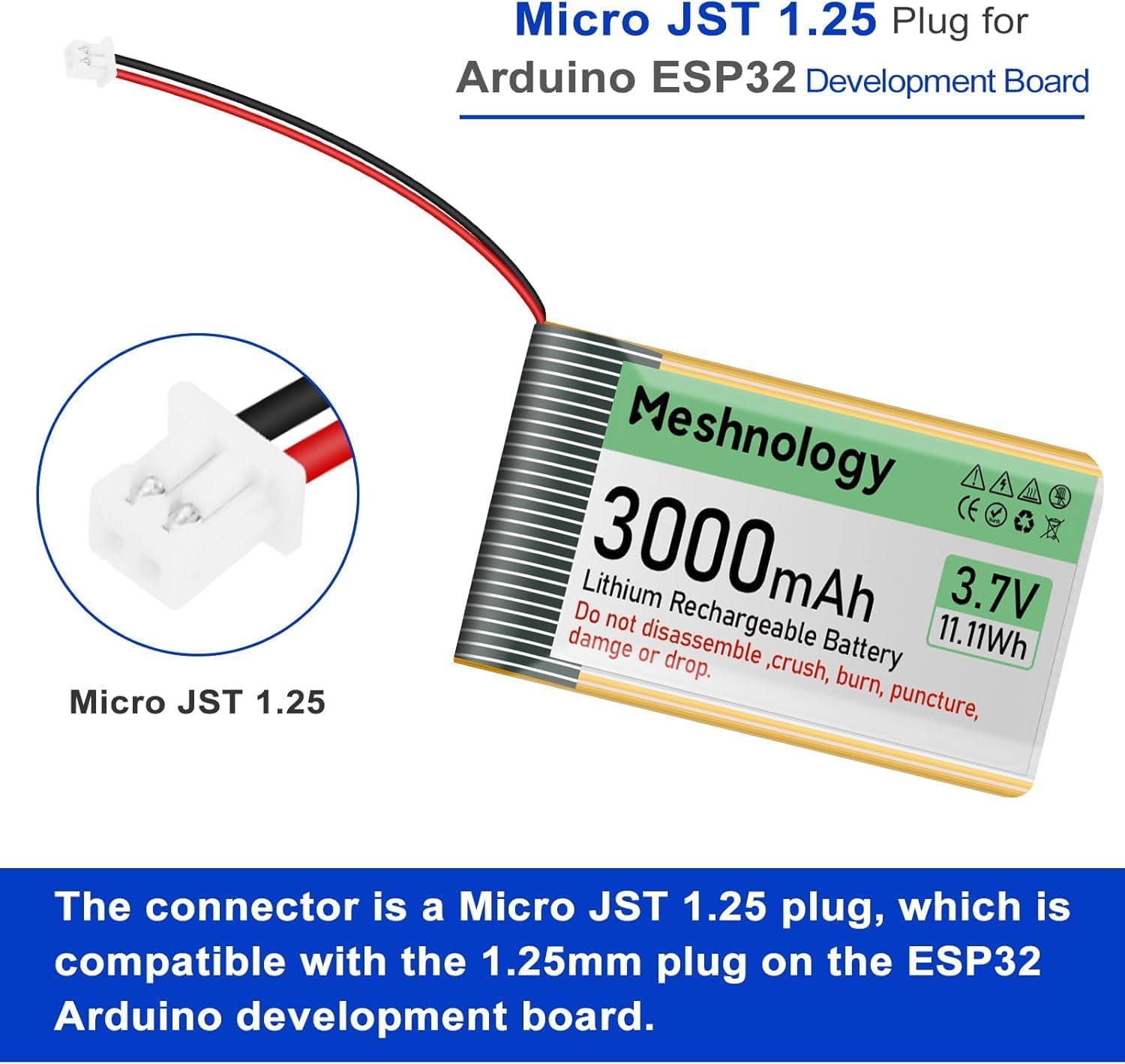 Robust Power Management: Equipped with a 3000 mAh battery and an integrated SH1.25-2 battery interface, our development board features a comprehensive lithium battery management system. It features charge and discharge management, overcharge protection, battery level detection, and automatic switching between USB and battery power sources.