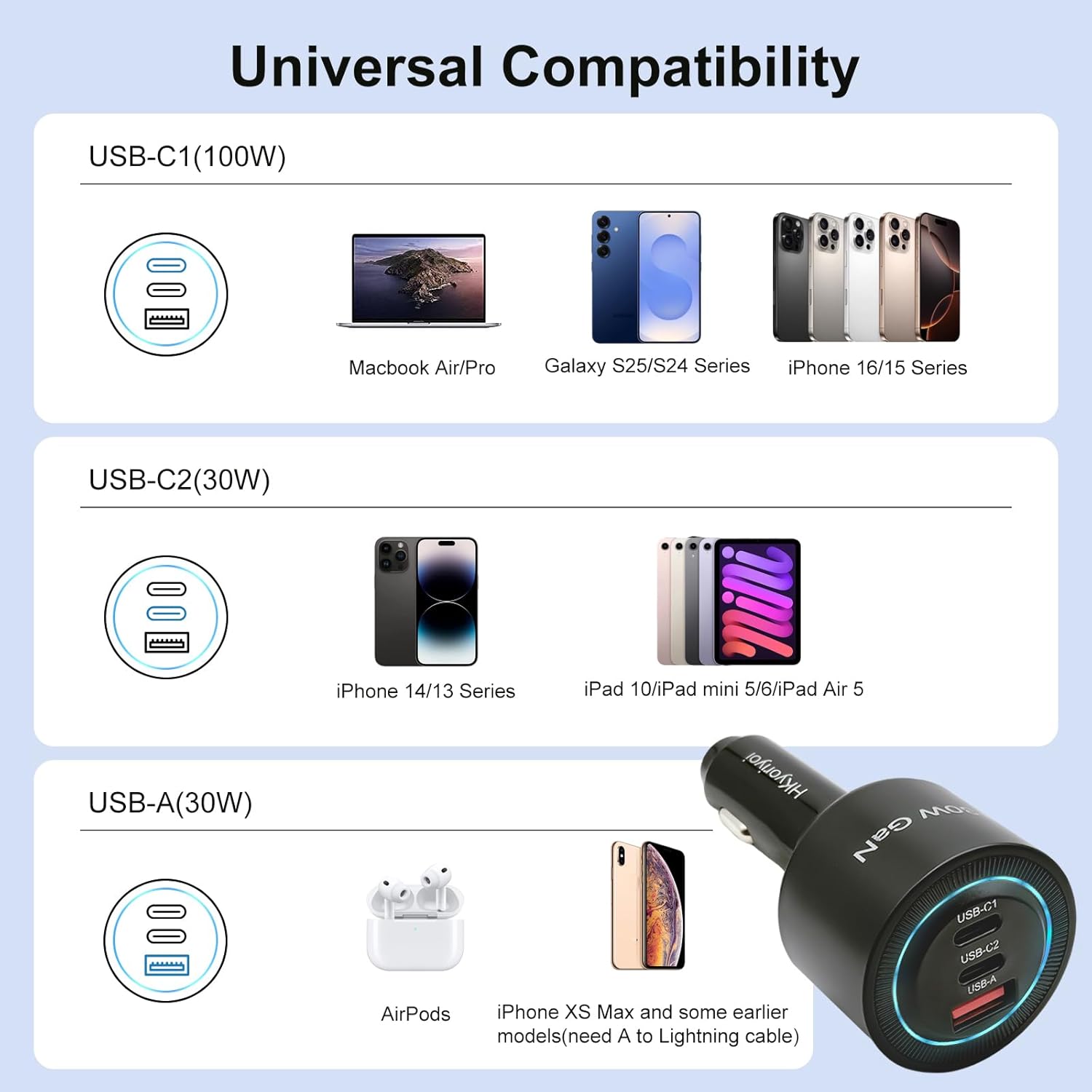 Input DC 12V-24V USB-C1 Output (PD3.0) 5V/3A, 9V/3A, 12V/3A, 15V/3A, 20V/5A(Max: PD3.0 100W) PPS: 3.3-21V/5A USB-C2 Output (PD3.0) 5V/3A, 9V/3A, 12V/2.5A, 15V/2A, 20V/1.5A(Max: PD3.0 30W) PPS: 3.3-11V/3A USB-A Output 5V/3A, 9V/3A, 12V/2.5A(Max: 30W) Max Total Output 130W Support Fast Protocols PD3.0, PPS, QC3.0, QC2.0, FCP, SCP, AFC, UFCS Protections Over current protection, over temperature protection, short circuit protection, over voltage protection, fire resistance, anti static For Laptops Compatible for MacBook Pro 14″/13″, MacBook Air, HP Elite, Google Pixelbook, Surface Pro, Surface Laptop For Mobile Phones Compatible for iPhone 16 15 Pro/ Pro Max/Plus, 14 13 Pro / Pro Max / Mini, iPhone 11 / 11 Pro / 11 Pro Max, iPhone XS / XS Max / XR / X, iPhone 8 Plus; Galaxy S25 Ultra/S25 / S24+ / S23 / S23+/ S22/ S22+/ S22 Ultra/ S10/ S10e/ S10+/Note 20 Ultra/ Note 20/ Note 10/ Note9/ Note 8; Google Pixel/ Pixel 3XL/ 3/ 2XL/ 2, Sony Xperia, LG G7 / V30+ and more. For Tablets Compatible for iPad 12.9″, iPad Pro 11″, iPad mini 5, iPad Air 3, etc. iPad Pro 12.9”/ iPad Pro 10.5″/ iPad Pro 11″/ iPad mini/ iPad Air, ThinkPad E490, HP Spectre Folio. For Others Fast charging for Switch Host, Switch Dock, earphones, smart watch, steam deck, drones, camera, power bank, speaker etc. Note When multiple devices are fast charging at the same time, plugging or unplugging one device from the car charger will cause a brief pause in charging for the other devices. This brief pause is because the usb c car charger is redistributing power and it will intelligently adjust the power output to protect your product’s battery. Note Built-in intelligent chip reduces power consumption when charging temperatures exceed 140°F to protect connected devices. Note Unsupported protocols: Sprivate super fast charging protocols, such as WARP charge (for OnePlus), VOOC Super Charge(for OPPO), for Xiaomi/ Redmi Super Charge, POCO Super Charge, for Realme Super Charge and those laptop without supporting PD charging. Note Actual charging power depends on both your device and cable capabilities. The C1 port in Buck-Boost mode. After boosting the voltage, the device will initiate charging once the handshake protocol is confirmed. This ensures connected devices remain undamaged.